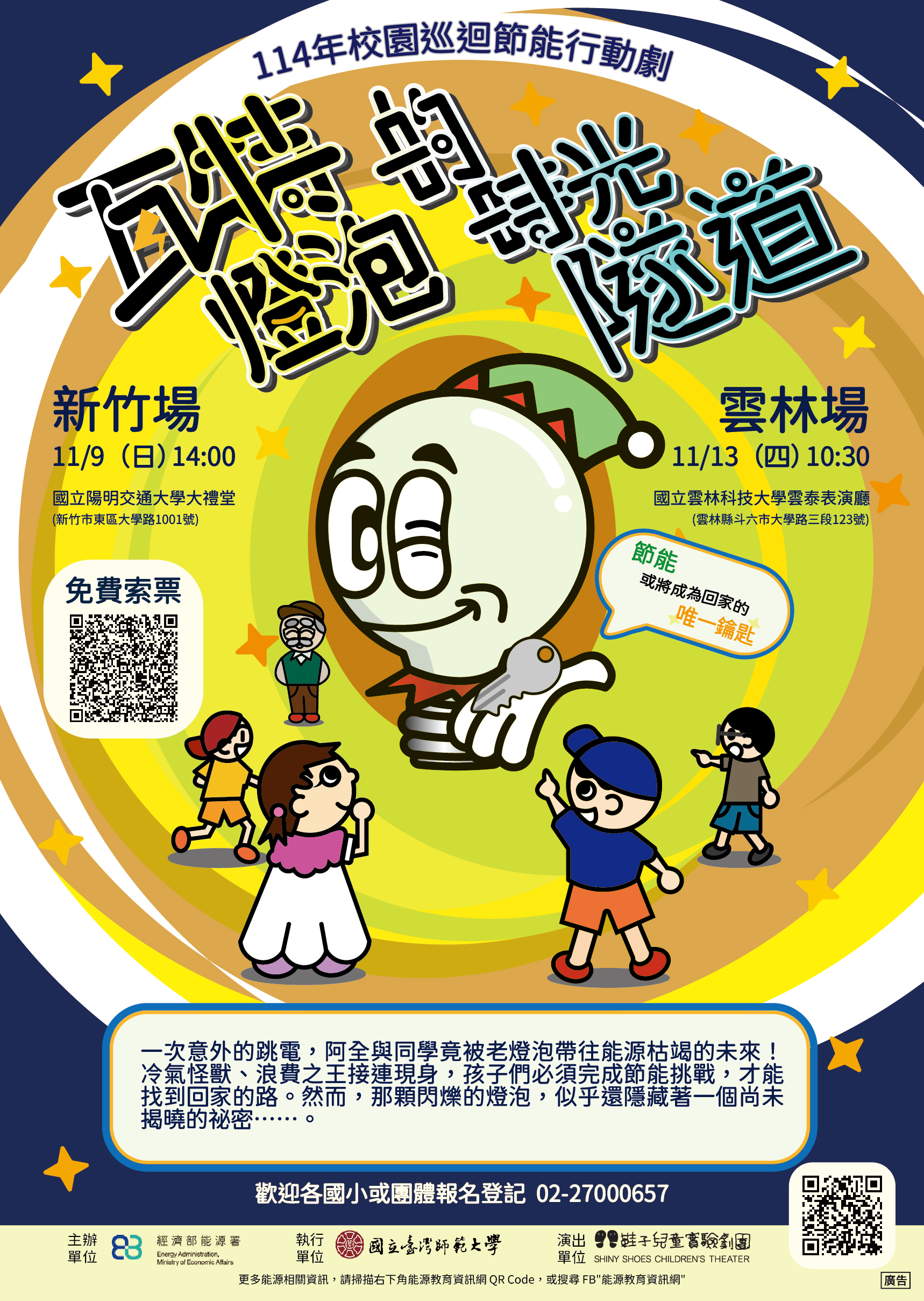 〔記者:張永勳 台北報導114/10/08〕 節能行動劇免費登場10/9平鎮民俗文化公園開演 鞋子兒童劇團推出全新節能行動劇《瓦特燈泡的時光隧道》,將於 10月9日(星期四)下午5點 在 桃園市平鎮民俗文化公園 免費演出。本劇以生動的兒童互動劇形式,融入「節能減碳」觀念,搭配輕快歌曲、趣味肢體動作與朗朗上口的歌詞,帶領孩子們在笑聲中學習節能妙方,寓教於樂,歡迎民眾免費入場觀賞。 時光隧道啟動!阿全穿越能源枯竭的未來 《瓦特燈泡的時光隧道》由 經濟部能源署、國立臺灣師範大學、鞋子兒童劇團 攜手製作。 故事從一次意外的跳電開始--阿全與妹妹竟被閃爍的老燈泡帶往能源枯竭的未來! 冷氣怪獸、浪費之王相繼現身,孩子們必須完成一連串節能挑戰,才能找到回家的路。 然而,那顆看似普通的燈泡,似乎還藏著一個未被揭曉的秘密…… 親子闖關樂趣多-平鎮現場互動寓教於樂 平鎮首演為免費入場,現場將設有 節能親子闖關遊戲區,邀請大小朋友一同體驗節能挑戰,在遊戲中學習節能知識。互動遊戲不僅讓孩子動起來、笑起來,更讓節能觀念自然融入生活中,輕鬆實踐節能減碳。 節能家電抽獎限定場:11/9、11/13加碼登場 劇團特別推出抽獎活動--將於 11月9日(六)國立陽明交通大學大禮堂 與 11月13日(四)國立雲林科技大學雲泰表演廳 現場舉行,觀眾可抽中多項節能家電好禮。 現場也將結合互動遊戲,讓觀眾邊玩邊學節能,樂趣滿滿。 免費入場|索票開放中 ✨ 節能,或將成為回家的「唯一鑰匙」 ✨ 🔑 新竹場 11/9(日)14:00 國立陽明交通大學 大禮堂(新竹市東區大學路1001號) 🔑 雲林場 11/13(四)10:30 國立雲林科技大學 雲泰表演廳(雲林縣斗六市大學路三段123號) 📍 索票連結: https://reurl.cc/4N0MyL 洽詢電話:0933-035031/02-2700-0657 索票連結 📌 注意事項: 1開演前 1 小時開放取票,開演前 30 分鐘開放入場。 2一人一票,憑票入場,對號入座。 3開演前 15 分鐘仍未取票且未事先告知者,票券將釋出給現場民眾。 4索票成功將以 Email 通知,請留意信箱。 5歡迎各國小及團體來電索票。 校園巡演進行中-節能知識變身有獎問答 十月起,《瓦特燈泡的時光隧道》展開全臺校園巡演,走入各地國小,以輕鬆有趣的方式推廣節能知識。校園場特別設計 「有獎問答」,讓學童透過搶答與互動遊戲,加深對節能概念的理解與記憶,讓節能從劇場走進日常生活。 友善票券行動-邀社福團體孩子共享藝術時光 《瓦特燈泡的時光隧道》於 11月9日新竹場 與 11月13日雲林場 特別推出「友善票券」計畫, 與新竹及雲林地區在地社福團體合作,邀請公益組織與特殊境遇家庭的孩子們免費進劇場觀賞。 讓不同背景的孩子都能親身體驗劇場魅力,從觀戲中學習節能、體驗藝術,擴展多元的學習視野。 |主辦單位|經濟部能源署 |執行單位|國立臺灣師範大學 |演出單位|鞋子兒童實驗劇團