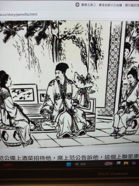 范公子說:我有上聯,若你用對下聯,就放你回去。上聯曰:「拍名渾不似」,仇祿對曰:「銀成沒奈何」(註一),范公子聽了大為驚異。緣以上聯是女兒蕙娘求婚之用,始終得不到合適下聯,如今配對巧妙,可謂天賜姻緣,便請仇祿留下來入贅。(註:照片翻拍自https://kknews.cc/story/pemx9zz.html)