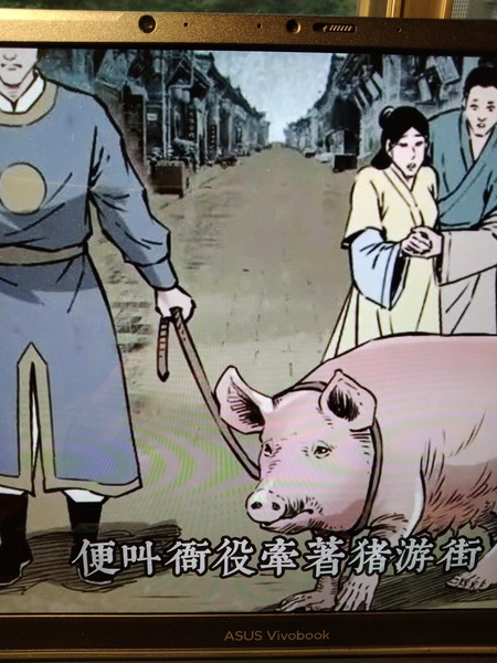 縣令聽了這件事,便命人將豬拴出去遊街,以告誡眾人。(註:照片翻拍自https://www.youtube.com/watch?v=fRfcbzK-Tp0) |