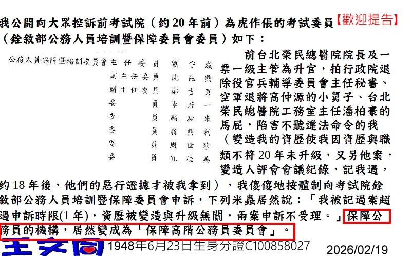 好熟習的惡夢 從高金素梅被鎖談起 前言:羅馬帝國時期天主教神學教授阿奎那說:「在一且可能改變人的因素中,最強烈的是酒;其次,是女人;再次,是強權;最後,才是真理。」古希臘懷疑論的創始者,皮朗說:「當人對權威、富貴、英雄產生質疑的時候,獨立思考的能力才逐漸出現。當人們用理性邏輯去質疑權威、富貴、英雄的時候,獨立自主的意識才趨於成熟。」 立委高金素梅被檢調蒐索,這下流、無恥、反民主法治的流氓行徑,又令我發抖的26年前、公務生涯的一場夢魘: 2000年某天,上午十點左右,三個流氓樣子的人,到我辦公室,出示警察證件及搜索票,說我牽涉「偷竊」要搜索我石牌台北榮民總醫院的宿舍,突然的霹靂,生平雖沒做做虧心事,但還是心慌了,也就由它們了。 搜索完了,三個流氓說要搜索基隆、快八旬我的老母家,於是三個流氓押我驅車到基隆老母家,翻天覆地,老天保佑,我老母和我一樣,身心健康,挺過一場驚心動魄的鬼打牆。這還沒完,更下流的要求,要搜索我前妻的家,一場震撼教育後,我被羞辱到臉發麻,我也「不要臉了」,驅車再回到台北市警察局北投分局作筆錄,折騰到往上9點,「請」我回去。過了兩天,要我測謊,我毫不猶豫答應,搜索及測謊結果都沒有還我清白,這是2000年馬英九當台北市長時,發生的事。 我任職台北榮民總醫院工務室機械職類工程師,不服從工務室主任潘柏豪違法命令,潘柏豪養了國防部情報局一個上校沒生少將的處長,被外調到工務室,當他的狗,耀武揚威,人見人畏。我天生就是就喜歡打狗給主人看得個性,當然狗及主人都對我懷恨在心。潘柏豪,是個草包,但他姊夫是空軍退伍中將,在退除役官兵輔導委員會當主任秘書,後升該會副主任委員、後又任不分區軍系立委,所以這個草包的背骨硬的很。台北榮民總醫院院長、副院長、政風室主任、人事室主任、主任秘書的陞遷,決定權在退除役官兵輔導委員會,所以上述首長、主管都摸潘柏豪的屁股。這案子,當然是台北榮民總醫院主官、主管為了陞官的投名狀。 我除了被栽贓外,我的資歷(甲種輪機長)被偽造成丙種三副(與機械職類不符,(我20年沒陞級),人事室還偽造文書,捏造事由記我過,著些事是人事室操刀,我被埋在鼓裡,直到人事室同仁,看不過去,在我快退休前,偷偷把證據影印,丟到工務室影印間,被同仁撿到,丟給我。傻傻的我,按照體制內程序,向考試院銓敘部公務人員培訓暨保障委員會申訴,結果:考試委員說:「事發已超過一年追訴期(事發19年後我才握有證據耶!),資歷與升遷無關(就算無關,所以可以偽造?這是像考試委員說的話?還是人民養的狗在吠?)」 有一次,外包廠商偷抽地下水地下道施工,這是嚴重違法,該工程非我管,但地下水屬我權責,我得依法檢舉,沒想到管工程的行政副院長,居然語帶威脅的對我說:「你沒有證據,可是污衊!」,我提出證據,他居然不追辦。 以上種種、罄竹難書,雖事過境遷,我莫齒難忘,我沒有被國家黑暗勢力輾壓而倒下,也彌足抬頭挺胸、感謝頭上三尺的神明。 以下是我指控,參與迫害我的人或公務機關。歡迎提告! 台北榮民總醫院前院長張茂松 台北榮民總醫院前副院長雷永耀(縱容廠商偷竊地下水施工,反恐嚇我陷害廠商) 台北榮民總醫院前秘書室主任易屏東 台北榮民總醫院前政風室主任韓厚忠 台北榮民總醫院前人事室主任范綱明 台北榮民總醫院前工務室主任潘柏豪 國防部軍情局前資料處理處處長外調台北榮民總醫院工務室專員李復興 台北地檢署檢察官(女、姓陳,搜索票警收回,我沒記得名,瀆職 。) 台北市警察局第北投分局(瀆職) 考試院銓敘部公務人員培訓暨保障委員會(瀆職) 後語:高金素梅被搜索,不是藍綠的政治鬥爭,是人性本惡的千古遺傳,是不會停止的必然。 作者本人:王文同 民國37年6月23日生 身分證C100858027 以上個人或機關歡迎對本人提出告訴 |