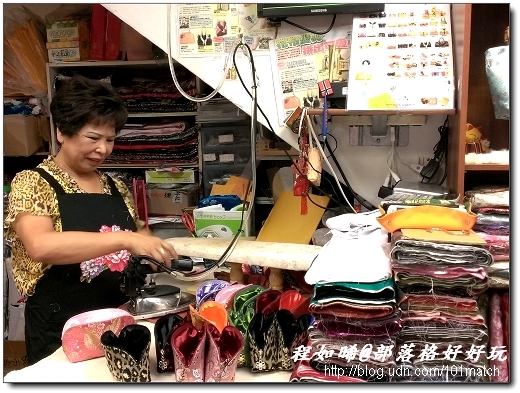 ↑好美麗典雅的衣服喔!不不不~人家是斜背包 撰文.攝影╱程如晞 接續前篇大龍峒商圈深度之旅》台北孔廟4D劇院體驗與必敗文創紀念品,並在傳承50年的正一堂養生膳食坊吃一盅人蔘干貝雞套餐,如晞補足了元氣準備在俗稱的大龍峒四十四坎瞎拼了。