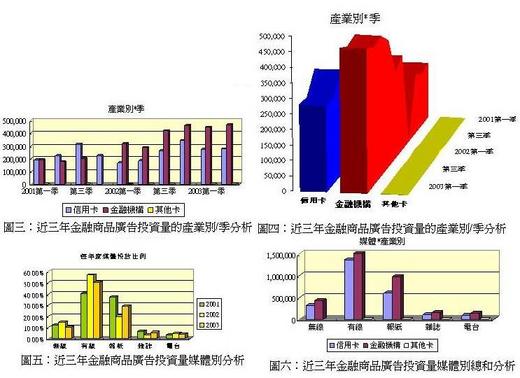 數字、動向與趨勢 - 解構金融商品廣告量 黃振家 新世紀的台灣,對於廣告產業而言,可以說是進入整理與盤整的競爭局勢,廣告代理商、媒體代理商與媒體,為求生存,無不使盡全力,相互爭奪廣告商有限的廣告預算,廣告代理商受到媒體代理商與媒體的雙重擠壓,維繫與爭取廣告預算的壓力之大,可以想見,在市場動向未明,廣告商持觀望的保守心態下,廣告代理商在努力爭取新客戶之餘,莫不苦思找尋具業務潛力、同時前景大好的新興業務來源。 基本上,廣告投資量對於廣告產業來說,就是廣告商在類別商品的廣告預算投資金額,藉由廣告投資量所提供的數字,廣告代理商一方面可以瞭解單一市場的廣告投放業務潛量,作為擬定廣告預算的參照基準,另一方面,也可以明白相同類型的競爭商品,在廣告市場上的活動狀況,進行廣告聲量分析( Share of Voice ),提供作為媒體企劃的比對基礎,因此,看似簡單的廣告量數字,其實饒富行銷傳播實務的作業意涵。 有趣的是,那麼如何針對所謂看似簡單的廣告量數字來進行分析?換言之,如何「洞察」廣告投資量,呈現市場的動向與趨勢?事實上,如果你打開電視機,收看有線電視琳瑯滿目的股市分析頻道,或是翻開報紙,看看證券版上的各種分析報導,似乎不難發現,對於數字的解釋分析,廣告市場投資量的分析,的確值得向證券市場取材與學習。 一般來說,股票市場投資的複雜程度相當高,台灣地區的股票市場更甚於其他地區,每日的市場交易行情,其實牽動大盤的漲跌走勢,無論是開盤前中後,市場分析師皆會對於各種數值與情報,提供各式各樣先見後見之明的說法,提供投資人作為選股換股的投資參考,相對而言,投資人也會在各種數字當中,瞭解市場的動向與趨勢,及早因應、調整與應用自己的投資籌碼以獲利。 同樣的概念,如果轉換到廣告投資市場,每日每週每月每季每年,各種類別商品在廣告市場上活動,透過媒體版面空間與秒數時間的交易,各種廣告素材在媒體上出現,期待與廣告目標對象進行溝通,廣告商在媒體上所投資的廣告預算,一方面,反映廣告商本身在經營類別商品上的企圖心,另一方面,也突顯出類別商品產業的榮景樣貌。如何加碼減碼?何時進場出場?在廣告媒體市場當中,同樣受到廣告商的關心與注意,相對地,對於汲汲追逐廣告預算的廣告代理商、媒體代理商、媒體而言,廣告投資量的數值動向,更是無法忽視的業務數值。 如果以金融商品為例,運用前述的廣告投資量分析的概念,不難看見金融商品的廣告榮景,似乎已經湧現。根據潤利公司所提供的廣告投資量的資料顯示,如果將金融商品區分為信用卡、金融機構與其他卡,分析近三年的廣告投資量( 2001-2002 年全年, 2003 年 1-6 月),大體而言,在總量新台幣 56.8 億元的廣告投資當中(請參見表一,圖一),以金融機構佔 56.29 ﹪居首,其次為信用卡佔 43.53 ﹪,其他卡僅佔微量 0.18 ﹪,其他卡除外,若 2003 年下半年沒有太大的變化,將總量以季節來呈現,(請參見圖二),似乎可以看見金融商品的廣告投資皆呈現成長態勢。 表一:近三年金融商品廣告投資量全媒體總量分析