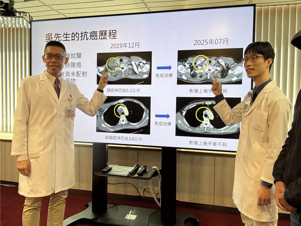台中榮總團隊進一步進行免疫染色檢測,發現吳先生腫瘤PD-L1指數高,且無標靶基因突變,是典型適合免疫治療的患者,因此啟動「免疫治療合併化療」。治療後,他的體力與生活品質明顯改善,6年追蹤影像顯示,原本4到5公分的腦部腫瘤幾乎看不見,胸部病灶也獲良好控制。 如今他已恢復工作,也能陪伴孩子成長。他動情地說:「看到女兒上大學,覺得一切都值得。」確診後,他也學會調整生活步調,不再事事追求完美,家人的陪伴更是支撐他走過低潮的重要力量。 台中榮總胸腔腫瘤科主任曾政森指出,肺癌治療已邁入「精準醫療」時代,醫師會依據病人的基因變異、PD-L1表現量等特徵,選擇最合適的標靶、免疫或化療組合,讓治療效益最大化。 胸腔腫瘤科醫師李柏昕進一步說明,免疫治療能解除腫瘤對免疫系統的「剎車」,活化 T 細胞重新攻擊癌細胞。對 PD-L1 高表現且無基因突變的患者,免疫治療合併化療可提供顯著且長期的疾病控制,吳先生即是成功案例。 曾政森也強調,第四期肺癌的治療目標已從過去的「延長生命」轉向「慢性病化管理」。許多患者可在治療下維持日常生活、持續工作,就像控制糖尿病、高血壓一樣,只需定期回診、追蹤治療。他提醒,抗癌不僅是藥物治療,更需要心理、營養與全人照護,醫院團隊也會全程陪伴,協助患者維持生活品質與尊嚴。 【醫學-健康- 科學-教育】告訴父親按摩你的睪丸!男生很多人都不知道保養|幸福晚年 加強骨盆底肌群 解決 攝護腺腫大、夜尿、腎虧 【健康與飲食】更新5大原則吃出好心臟、增強免疫力、武肺疫情(台灣疫情)資訊一覽表:醫、營養師推薦「一張表」「地中海飲食」 |