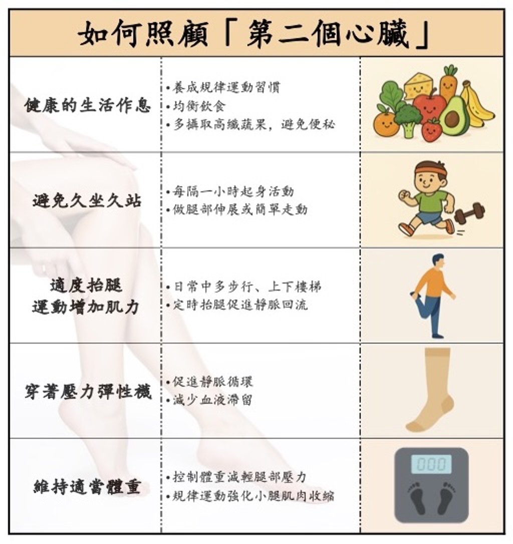 新竹馬偕紀念醫院陳亭安醫師表示現代人的生活型態普遍工作壓力大,長時間的久坐久站,又容易缺乏運動;長久下來,下肢靜脈疾病的風險也隨之增加,若說下肢靜脈疾病是現代的文明病之一,一點也不為過。預防文明病最重要的即生活模式的調整,因此,在長時間站立或是久坐時,適時地起身走動對於促進血液循環、預防下肢靜脈疾病相當重要。 ![]() 如何照顧第二個心臟。(馬偕醫院提供) 如何照顧我們的「第二個心臟」?當我們說小腿是「人體的第二顆心臟」,其實是在提醒我們小腿在血液循環中扮演的重要角色,平日裡也該記得照顧這雙擔負重責大任的小腿。陳亭安醫師強調日常生活中,適時起身活動、做些簡單的腿部伸展,增加小腿肌肉收縮的機會,多走路、多抬腿,讓血液不易滯留在下肢血管內,協助血液回流心臟。對於有輕微症狀或靜脈功能不佳的人來說,穿著合適的彈力襪也能發揮支撐作用,有效減緩不適的症狀。此外,維持理想體重與規律運動,不但能減輕下肢壓力,還能強化肌力與心肺功能,讓這顆「第二心臟」持續為我們守護身體的健康。 【醫學-健康- 科學-教育】按摩你的睪丸!也教父執輩這樣做!男生很多人都不知道保養|幸福晚年 加強骨盆底肌群 解決 攝護腺腫大、夜尿、腎虧 【健康與飲食】更新5大原則吃出好心臟、增強免疫力、武肺疫情(台灣疫情)資訊一覽表:醫、營養師推薦「一張表」「地中海飲食」 【醫學-健康- 科學-教育】走路防失智!哈佛揭「黃金步數」:認知退化減緩56% |