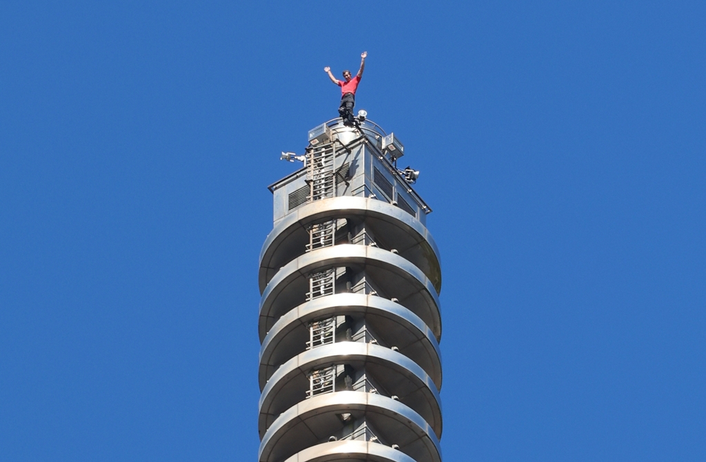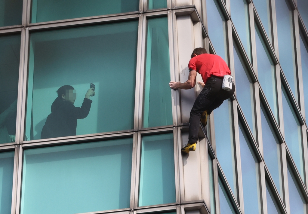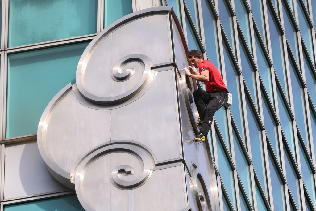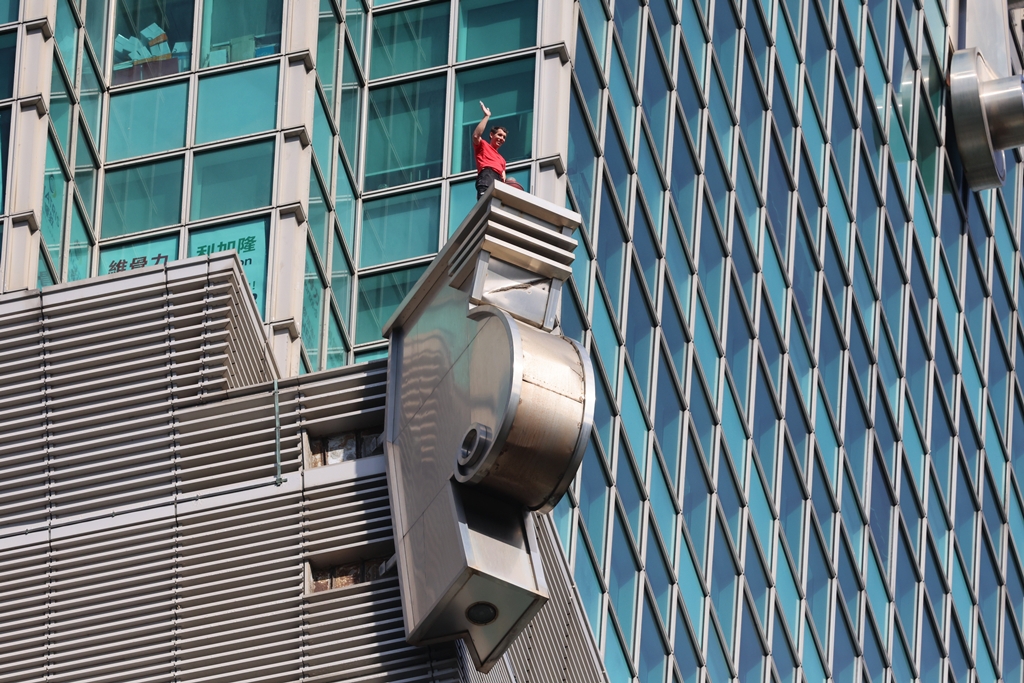 霍諾德今上午約9時12分起開始攀登台北101。(圖/黃世麒攝)