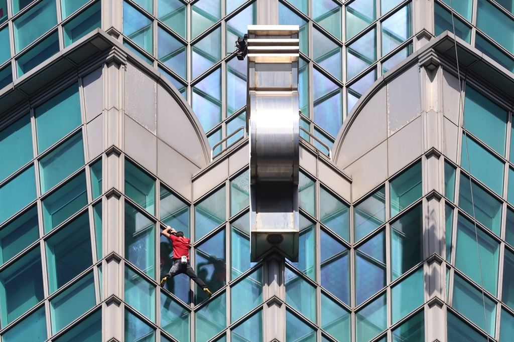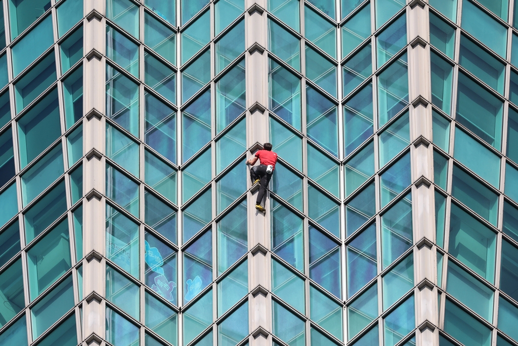 霍諾德在玻璃帷幕中移動。(圖/黃世麒攝)