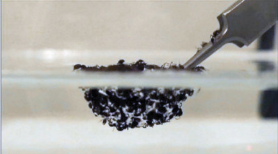 (May 11, 2011電)科學家發現南美洲熱帶雨林一種火蟻(Fire Ant)的生存能力驚人,不僅不怕水,甚至還能利用團結能力,互相緊扣一起,形成一艘「蟻筏」在水面漂浮,防水能力好比Gore Tex。學者希望這次的發現,能夠應用於日後開發新的防水或漂浮裝置。 喬治亞理工學院學者對這種南美火蟻進行研究,把一群火蟻放在水上後,發現牠們會迅速向四周擴散,不到兩分鐘,整群火蟻便形成了一個圓形的平面,浮在水上。 火蟻身體表面擁有極細微的絨毛,防水能力極強,甚至可讓牠們得以在水上漂浮數個月。 學者又指「蟻筏」防水能力強,而且極具彈性,即使被擠壓,也可迅速恢復原形。原來火蟻以下顎和爪子緊緊扣住其他同伴,其力度驚人,是牠們體重的400倍。 研究人員用鉗子擠壓,蟻群立即形成防水層。(網路圖片)