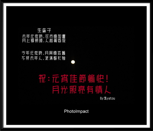 太多的人潮令我感覺呼吸困難,只想找個清靜無人之地喘口氣,可惜所望之處全是人,從老人到嬰兒,擠滿碼頭,等不到施放煙火,即匆匆和同事告別,騎著我的小腳踏車,沿著熟悉的小路,讓初春的風吹散鬱悶的氣息。 忽抬頭,望見一輪清亮、皎潔的月光高掛天邊,真是「明月如霜,好風如水,清景無限。」心因月色而溫柔,看那瑩白月光自樹梢穿透而出,全身彷彿被它的光華所包圍,舉起相機拍下月的柔情。