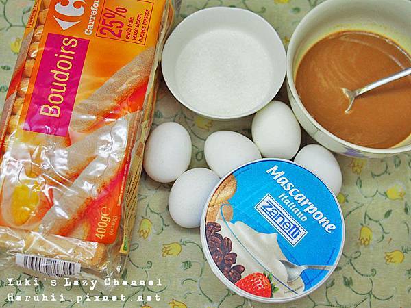 超簡單提拉米蘇材料如下: Mascarpone 馬斯卡彭起司 500g 細砂糖 100g 蛋黃五個 蛋白三個 手指餅乾 濃縮咖啡適量 (我拿COSTCO的即溶拿鐵兩包泡一杯代替XD) 可可粉少許