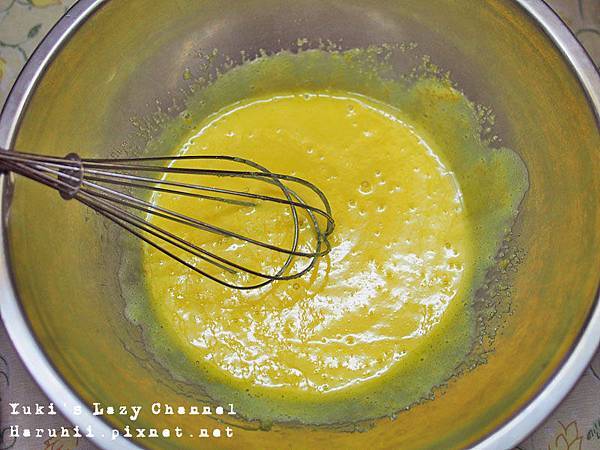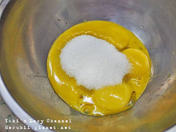 1. 蛋黃五個跟細砂糖50g用打蛋器攪拌均勻