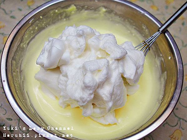 4. 將打發的蛋白分次加入步驟(2)的起司糊中拌勻