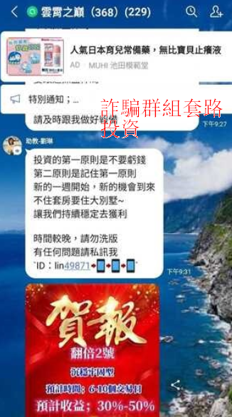 | 詐騙集團利用Google IG FB 賴 交友軟體簡訊等放出假的投資廣告,對外稱有內幕消息 股票穩賺不賠等字眼吸引受害人上鉤。 當受害人加入好友時候,詐騙集團會介紹客服、老師、助理同夥加賴聯繫。然後提供股票來投資,裝的像一個專業老師,然後群內有很多其他人發獲利賺錢的訊息讓受害人看,進一步吸引他過來投資這就是詐騙你的第一步,剛開始會讓你小獲利一部分,獲取信任後,讓你加大投資買仙股,等待一段時間後再收割,一般都會暴跌百分之八十,甚至出現讓你註冊假APP和平台裡面股票也都是虛假的,假冒的,讓你防不勝防,就算你提領一小部分錢出來也是也是其餘受害人給你入賬的錢,有可能也會讓你的賬戶成為警惕賬戶,大家要小心。 受害人資金全部