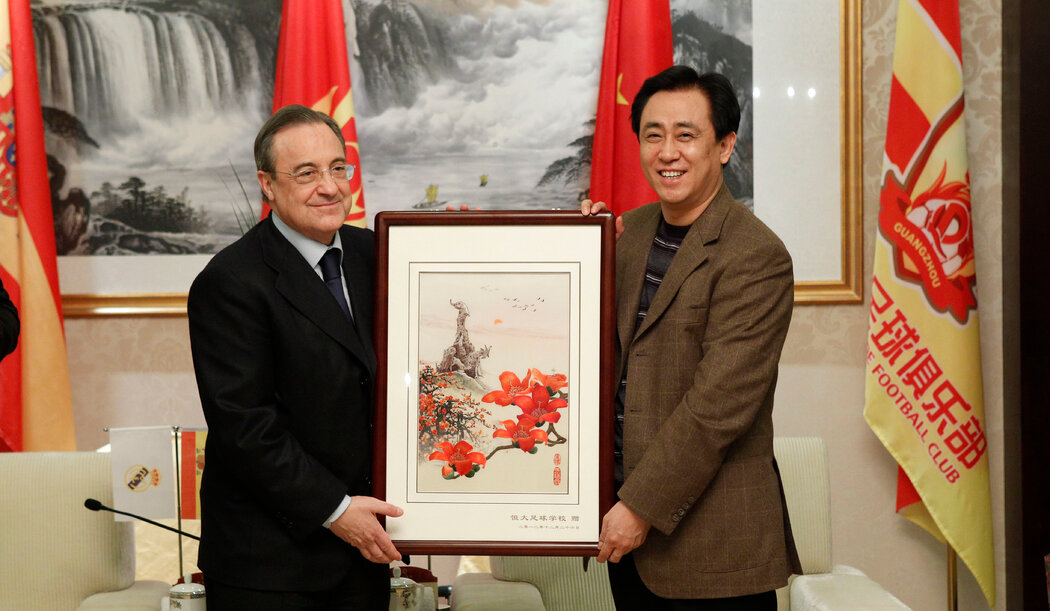許家印與皇家馬德里足球俱樂部主席弗洛倫蒂諾·佩雷斯2012年的合影。恆大曾經擁有中國最好的職業足球隊。