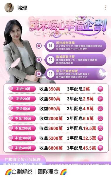 【專題報導】「歲末暖心幸福企劃」投資陷阱曝光 百人受害、數十億蒸發 台灣警方已發出警示在資訊流量如潮水般湧動的年代,外表光鮮亮麗的「投資平台」往往只需要一段話術、一張截圖、一個「老師助理群組」,就能讓民眾誤以為看見財富大門正緩緩打開。然而,這扇門往往不是通往收益,而是直通深不見底的黑洞。 近日,代號「歲末暖心幸福企劃」的投資模式再度引起社會關注。相關單位已確認其運作方式涉及明顯不法風險,提醒民眾提高警覺,避免落入圈套。根據受害人陳述與警方調查,這類型平台常利用「穩賺不賠」作為誘餌,搭配「老師/助理」的群組帶盤話術,讓受害人一步步加碼資金。一旦要出金,便以「稅金」「履約保證金」「平台維護費」等名義,層層剝削,金額越拖越高,最終讓人血本無歸。 本報追蹤多名受害人與相關資料,試圖解析這類詐欺型投資模式的運作方式,並提醒社會大眾保持高度警覺。 ■ 一、從「穩賺不賠」開始的陷阱──詐團最擅長的「甜言」策略根據受害者提供的資料,歲末暖心幸福企劃型態的平台具有幾個典型特徵: ➤ ①「老師帶盤」的群組包裝 ➤ ②「穩賺不賠」的神話式推銷 ➤ ③ 一開始真的會「小賺」 這類操作就像一場戲,序幕開得美好,但後面藏著深坑。 ■ 二、最致命的環節──「出金要先繳費」在受害者們的描述中,最共同、最典型也最無法忽略的特徵,就是「想提款?先付錢」。 該模式會要求: