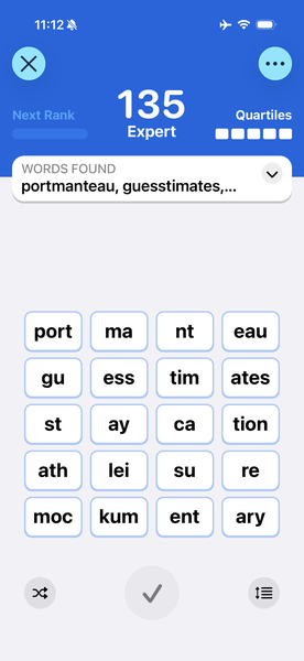 12月28日的字謎讓我花了將近四小時,主要是因為對那五個由四個字片組成的字毫無概念。好不容易找出的24個由1至3字片拼出的字之後,再也想不出可以拚的長字。 直到第二天早晨,試著把"moc"和"kum"擺在一起,google 一下,找出了"mockumentary",終於有點頭緒。接著找到"athleisure","staycation","guesstimates"。 最後剩下四個字片,卻怎麼也拚不出一個字。實在沒辦法,求助"Word Unscrambler"(幫忙解讀單字的網站),終於解出"portmanteau"這個字。(網上有人戲稱"破的饅頭")。 然後發現這組字謎的五個長字都是"破饅頭"(混成字)。