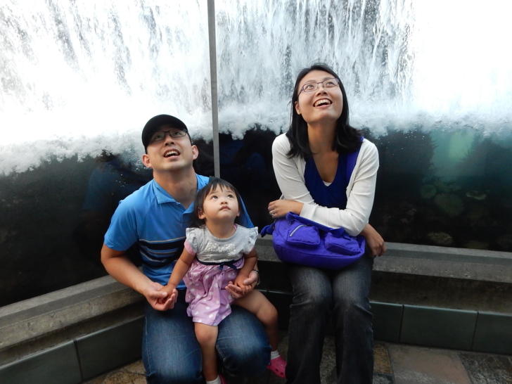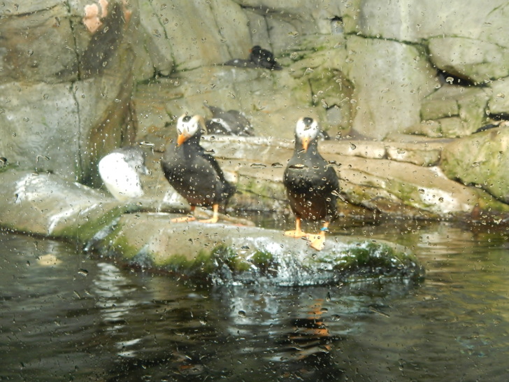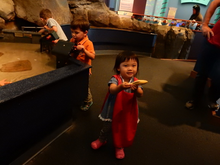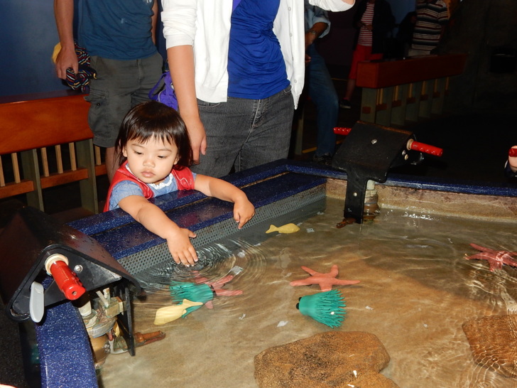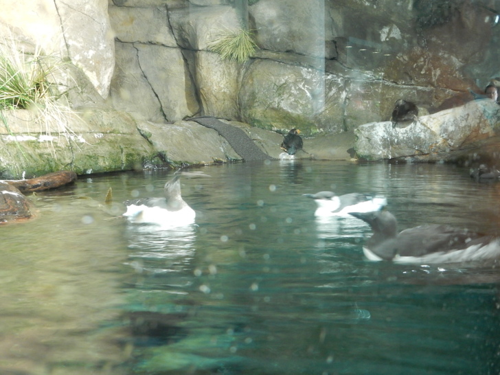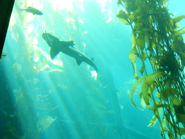 這座水池有幾台簡單機械,讓孩子操作鼓浪,了解洋流和生態。小阿美只要抓條玩具魚就開心了。 館中陳列了一些描述海洋的藝術品,其中幾件以海底和沙灘上的垃圾為創作材料,提醒訪客生態保育的重要。 我們參觀時遇到水族館進行海獺餵食,這些海獺因為受傷或其他原因被暫時收留。工作人員一面餵食,一面介紹講解海獺的習性,進行機會教育。 優遊水中的海獺,和大小魚群穿梭於巨型海帶叢 海獺進食的時候,旁邊的鴨子(以及別的水鳥)跟著受惠