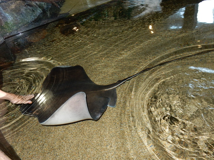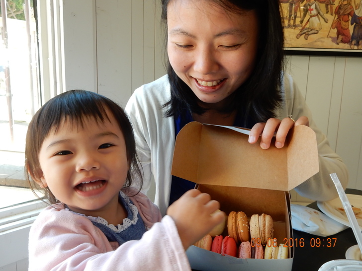 淺海處許多螃蟹,成為海鳥的大餐 除了自然的海潮,機器每隔幾分鐘泵進海水,讓館中動植物隨時有新鮮的海水,同時吸引近海的魚蝦蟹前來,提供保護區內海獅、海獺等大型動物豐富的食物。 感受過強大的「海浪」,差不多也該回去了。沿著參觀路線摸摸長尾巴的魟,再觀賞一下巨型水族箱裡的大魚,意猶未盡的離開。 那天適逢小阿美的生日,早晨去卡梅爾大教堂之前,我們特地繞到這家法式烘培店買了小點心,晚上卻忘了帶去給客人。