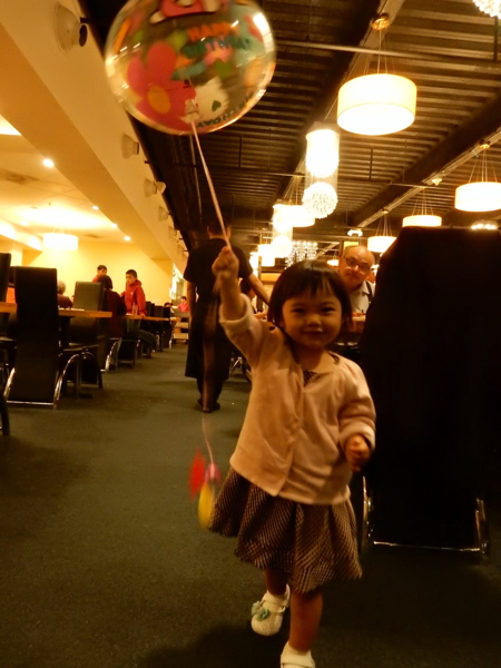 阿美的外公、外婆、和大舅一家都來慶賀。小妮子了解的事物中還沒有蠟燭,興奮的說"燈燈",也不知道要吹熄,需要表哥和媽媽幫忙。客人回去之後,她一個人玩氣球自得其樂。