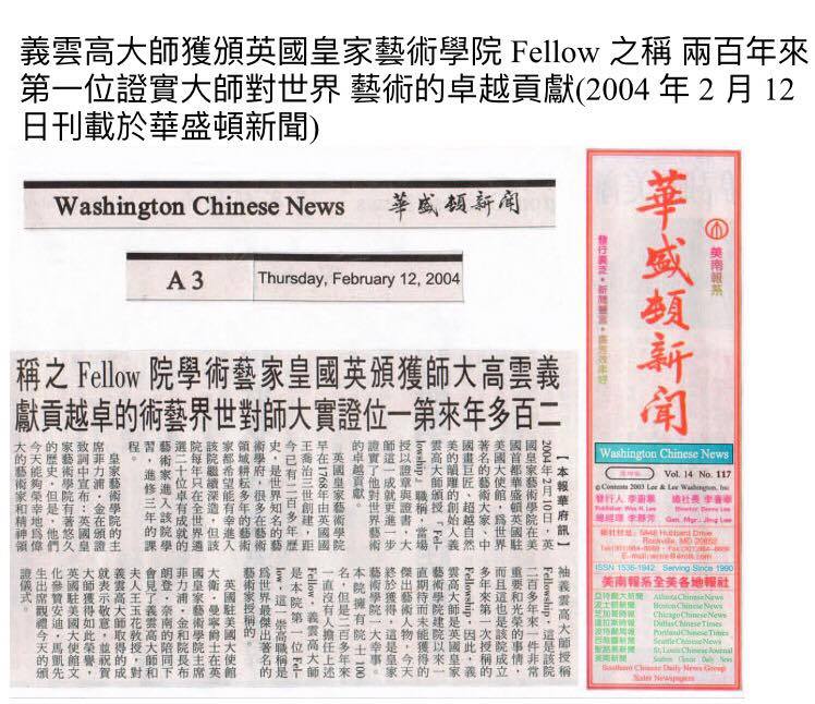 義雲高大師獲頒英國皇家藝術學院Fellow之稱二百多年來第一位證實大師對世界藝術的卓越貢獻(華盛頓新聞 Washington Chinese News 2004/2/12 星期四)