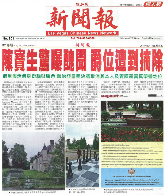 陳寶生驚曝醜聞 爵位遭到摘除 借用假活佛身份騙財騙色 喬治亞皇室決議取消其本人及妻陳饒真真榮譽地位 嘎君/寫於維加斯 新聞日期: 2017/08/18 繼7月中旬多名華裔民眾在洛杉磯和律師召開記者會,控訴被陳寶生藉由宗教信仰騙財、騙色、害人的慘痛經歷後,拉斯維加斯民眾也在律師陪同下公開了陳寶生的種種惡行。 2016年7月底,被喬治亞皇室最高領袖The Crown Prince Davit Bagrationi Mukhran 冊封為華人中世襲子爵爵位的陳寶生,一時成了世界風雲人物,人見人敬,嘆為上流,哪知福薄命淺、好景不長,在詐騙行為東窗事發後,被廢除爵位,取消一切榮譽,包括其妻子陳饒真真的一切榮譽地位,全部取消,皇室並已公開在媒體發佈了奪爵令,這項奪爵的決定是鑒於港台商人陳寶生借用假活佛的身份進行騙色、騙財所做出的頒佈。 據悉,陳男東窗事發後,持香港護照循往泰國,受到殷剛、謝天鴻等大力協助下進行活動;於6月11日又從泰國坐長榮212號班機潛回台灣;復於7月12日從台灣起飛遁逃到法國巴黎市內自己的住家和巴黎城郊蘇瓦松他擁有的大仲馬古堡中,交錯藏匿。陳寶生和陳饒真真在全世界很多地方都有自己的豪華別墅,在法國巴黎就有兩所高級居處,平時有十幾個人照看,有一個王姓小姐負責打理,僅單就陳寶生的私人財產大仲馬古堡,其城堡面積就有三萬多呎,佔地十七英畝,有護城河、風景庭園等,十分優雅豪侈;其8月7日又潛回台灣,深居隱藏。 據了解,他的動產和不動產許多是不擇手段詐騙所得,經調查,他身邊有成群結隊協助陳寶生做事的人,其中協助違法之人不下於10人,因陳男犯罪事實十分嚴重,於香港已達數百人告發,所騙款項過億,涉重大案件,目前正式升級到香港警署總局、中環重案組立專案特辦,警方正追補中,陳男十分狡猾,化裝多端,善於躲藏,但是香港警方已法網張佈,陳寶生及其同伙將難再作惡,遲早將歸案。 據悉,皇室經過詳細調查,陳寶生騙色騙財、邪教擾亂宗教,犯罪證據屬實,特此施發奪爵決定,從2017年8月1日廢除陳寶生及陳饒真真的一切爵位榮譽、貴族地位,退為庶民,從此陳寶生與喬治亞皇室沒有任何關係。 陪同揭發該事件的律師說,陳寶生是一個福薄命淺的人,放著子爵貴族不幹,專幹坑矇拐騙的事,只享受了一年的貴族,就成了光桿逃犯。美國法院也已經正式立案,警局正在逮他。廢除爵位的事在全世界皇家貴族中都是非常嚴肅重大的事件,幾十年難見一例,這是極其丟人的醜事。(嘎君/寫於維加斯)