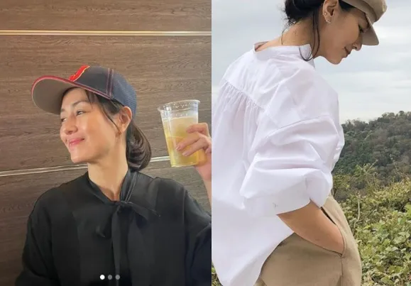 - 石田ゆり子: ナチュラルな装いに、ロゴが目立たないシンプルなキャップを合わせ、大人の余裕を演出。