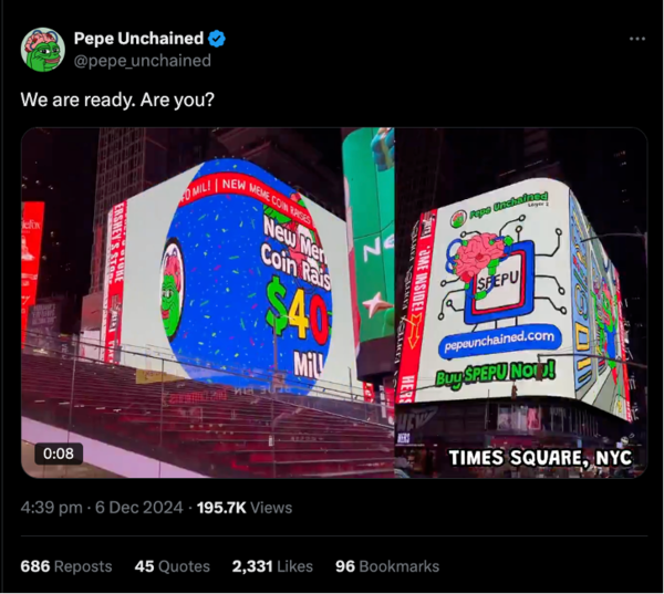 籌集的資金一直在為代幣持有者努力工作。自12月6日以來,每6分鐘就會播放一次時代廣場的廣告,進一步加劇了 FOMO(錯失恐懼癥)。