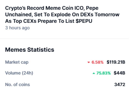 同時,Pepe Unchained 在CoinMarketCap上獲得了預先批準的上市資格,甚至在它開始在Uniswap上交易之前就已上線。它還在CMC社區動態中登上了熱搜。