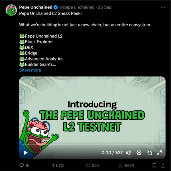 Pepe Unchained 絕非空頭項目。相反,開發者早在9月26日就發布了一段視頻,展示了生態系統的各項功能。