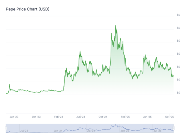 來源: https://www.coingecko.com/en/coins/fartcoin 情況在 PEPE 身上更為驚人。自 2023 年 2 月的低點以來,該代幣依然上漲了 12,518%,相當於 125 倍 的回報。 而那些在 2023 年 12 月高點附近賣出的投資者,則實現了約 50,762% 的收益,換算下來相當於自低點起 508.6 倍 的驚人漲幅。