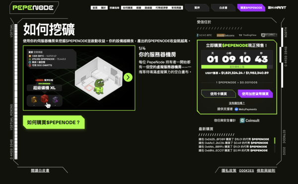 來源: https://www.coingecko.com/en/coins/pepe 如此爆發性的回報,在極短時間內實現,使比特幣潛在的 2.3 倍 漲幅顯得相對平淡。這也是為什麼自去年以來,迷因幣成為加密市場中最受投資者關注的板塊之一——它們具有更高的參與門檻可及性與巨大的潛在收益空間,為普通投資者提供了進入加密市場的全新機會。 而 PepeNode 正是基於這一可及性原則構建,將其理念延伸至虛擬挖礦遊戲中。玩家的虛擬算力架構越強、優化程度越高,獲得代幣獎勵(如 PEPE、FARTCOIN 以及其他熱門迷因幣) 的機會也就越大。 PepeNode 還設有競爭型排行榜系統,根據玩家表現發放額外獎勵。玩家不僅可以獲得 PEPENODE 代幣的常規收益,還能同時賺取這些高成長的迷因幣,從而讓虛擬挖礦成為兼具娛樂性與盈利潛力的全新加密體驗。 如何參與 PepeNode 預售如果你看好 “挖礦即賺取(mine-to-earn)” 的潛力,可以訪問 PepeNode 官方網站 立即參與預售。支援使用 ETH、BNB、USDT(ERC-20 或 BEP-20),甚至信用卡/借記卡購買。 投資者可以通過自己偏好的錢包連接,如 Best Wallet —— 這是業內廣受好評的加密與比特幣錢包之一。 目前,PepeNode 已在 Best Wallet 的“即將上線代幣”工具中列出,項目正式上線後,用戶可在應用內直接完成購買、追蹤和領取操作。 此外,PepeNode 的智慧合約已通過Coinsult的全面安全審計,為早期參與者提供了額外的安全與信任保障。 若想瞭解更多專案資訊,可關注 PepeNode 官方X(原推特)與Telegram頻道。 訪問其官網獲取最新動態免責聲明: 本內容為通訊社發布的新聞稿,僅供參考。我們未對其中的資訊進行獨立驗證,亦不對其準確性或所述服務承擔任何責任。本內容不構成投資建議或推薦,亦不應被視為此類建議。我們強烈建議您在參與任何金融活動或投資決策之前,請諮詢合格且受監管的專業財務顧問,以確保自身權益。 |