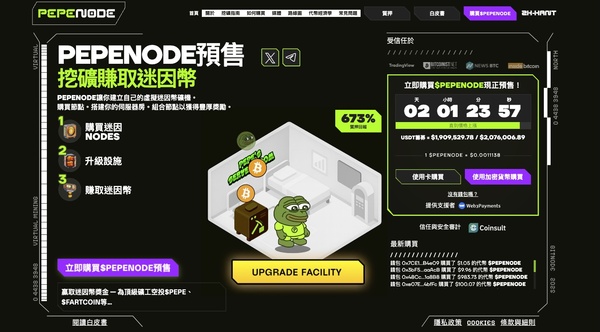 目前$MAXI已售出370萬美元,而預售價格約為0.000264美元,目標直指500億美元的狗狗類代幣市場。專案結構設計兼具娛樂性與永續性,持幣者可在預售階段鎖定代幣,獲得高達82%的年化回報。這種高強度收益模式吸引了大量社群參與,也讓Maxi Doge在短時間內成為迷因投資圈的重要議題。 除了獎勵機制外,Maxi Doge更著力於社群與平台的整合。 25%的代幣將用於推動Maxi基金,用於舉辦競賽與推廣合作,未來或將與槓桿交易所推出專屬$MAXI交易對。此舉將迷因幣敘事與實際交易結構結合,創造出一種融合娛樂、槓桿與社群的獨特生態。投資人看好其在迷因經濟中的擴張潛力,認為它可能成為下一個接替Doge與Shiba Inu熱潮的焦點幣。 官網購買Maxi Doge ($MAXI)Pepenode:遊戲化挖礦結合高收益質押的創新模型Pepenode($PEPENODE)則以「遊戲化挖礦」重新定義迷因幣的玩法。此專案結合Pepe文化與高收益質押機制,讓玩家在遊戲過程中同時獲得挖礦收益與代幣獎勵。這種結合趣味與回報的設計,吸引了廣泛的散戶與NFT社群參與。 Pepenode建立於以太坊區塊鏈上,用戶可購買Miner Nodes並在虛擬礦場中模擬挖礦過程。升級設備可提高挖礦效率,創造更多代幣收益,將遊戲機制與真實經濟回報融合。根據預售設計,年化報酬率高達673%,代幣以每ETH區塊3,001個的速度發放,並在兩年內穩定釋出,確保供應節奏與價格穩定。