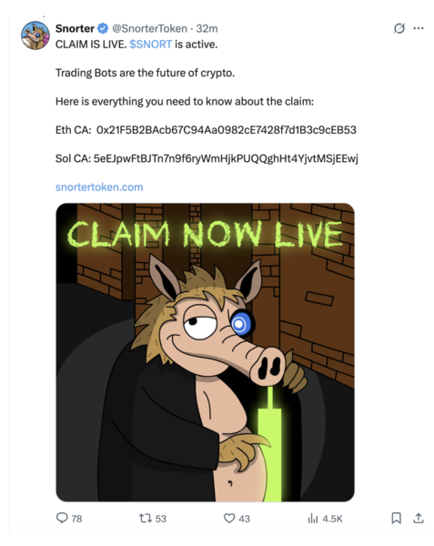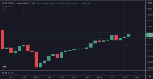 2025年10月27日(星期一)——備受矚目的Telegram交易機器人Snorter Bot Token(SNORT)於今日正式在Solana與Ethereum上線,在此前完成了總供應量的一半銷毀後,被市場譽為下一個Banana Gun。 憑藉Solana基礎架構帶來的高速性能與全行業最低的交易費率,Snorter Bot具備明顯優勢。其最大競爭力在於僅0.85%的交易費——為目前市場最低——以及無限次搶購(sniping)權限,兩者皆需持有SNORT代幣方可解鎖。這一設計自然形成強勁的需求動能,隨著越來越多交易者加入生態系統以使用這些高端功能,代幣需求持續增長。 早期在預售階段以0.0935美元入場的投資者目前已可實現短線獲利,但真正的大資金預期會在盤整期後陸續進場。 SNORT代幣最初掛牌價格為0.1083美元,目前於Solana與Ethereum兩條鏈上均回落至0.0785美元。雖然剛開始時Solana鏈上的交易量更高、價格也有明顯溢價,但這一差價已被市場套利機制迅速抹平。 值得安心的是,現已有43.2萬美元的流動性被鎖定,投資者無需擔心跑路(rug pull)風險。 請務必在正確的流動性池進行交易: Solana: https://birdeye.so/solana/token/5eEJpwFtBJTn7n9f6ryWmHjkPUQQghHt4YjvtMSjEEwj Ethereum: https://www.dextools.io/app/en/ether/pair-explorer/0x66af30A2A6158fe6c57057800A8eFECC32D524ba