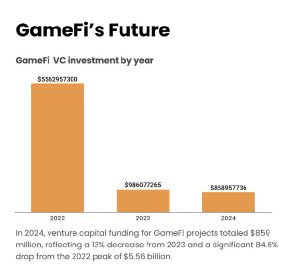 它完美模擬了真實的加密貨幣挖礦體驗,只是沒有風扇噪音與電費開銷,讓挖礦變成一場講究技巧與策略的數位遊戲。 隨著玩家不斷優化挖礦配置,他們能登上排行榜,獲得的不僅是PEPENODE代幣,還包括熱門迷因幣如Pepe(PEPE)、Fartcoin(FARTCOIN)等。 若某些節點表現不佳,玩家還可將其賣回並重新調整礦機配置,隨時調整策略以保持領先優勢。 PEPENODE會是下一個GameFi巨頭嗎?根據ChainPlay去年的《GameFi現狀報告》,該行業面臨殘酷現實:「93%的GameFi專案已經死亡。」報告指出,大多數專案難以同時維持投資者與玩家的熱情,導致整個GameFi領域動能流失。 同一份報告還揭示,平均GameFi代幣價格已較歷史高點暴跌95%,而風險投資資金也大幅萎縮,從2022年的55.6億美元銳減至去年的8.59億美元。