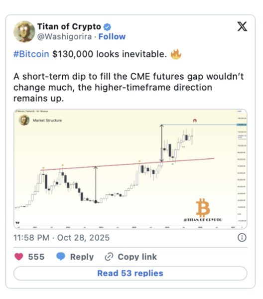 來源: TradingView 然而,技術分析師普遍認為宏觀格局依然強烈看漲。根據市場分析師TitanOfCrypto近期發布的圖表,比特幣今年早些時候已突破長期下降趨勢線,這意味著整個週期仍遠未結束。 從結構上看,BTC目前正處於下一波主要上升段的中期階段,依據量化測算,潛在目標價位約在13萬美元附近,較現價仍有約12%的上行空間。Titan同時指出,短線若出現回調以填補CME期貨缺口,也不會改變整體多頭方向,因為長周期走勢依然穩定向上。換言之,任何回落都更可能被視為逢低買入機會,而非趨勢反轉的信號。