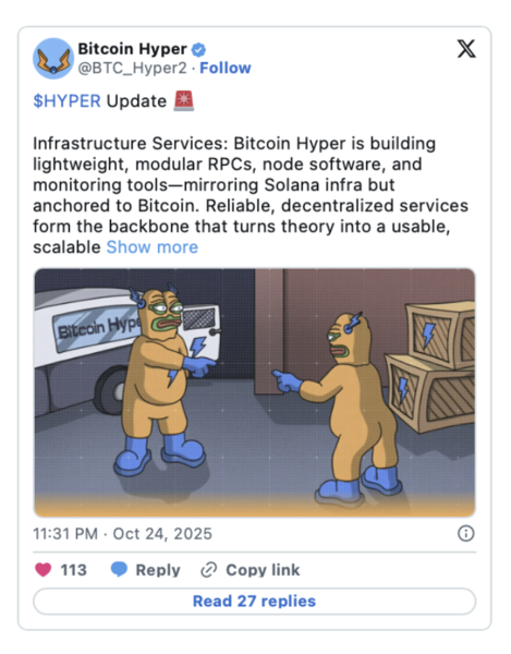 https://twitter.com/BanklessHQ/status/1978174112578380213 Hayes與Lee或許正押注於所謂的「Moonvember」——歷史上對比特幣最為友好的月份,這段期間BTC往往出現強勁上漲。而隨著聯準會態度由鷹轉鴿、宏觀環境逐漸寬鬆,這一時機顯得尤為關鍵。 但市場的另一個潛在催化劑其實早已浮現:Bitcoin Hyper。許多早期投資者認為,它將引領比特幣邁向以實用性為核心的新一輪需求浪潮。 從技術層面來看,Bitcoin Hyper以Solana虛擬機(SVM)為基礎構建生態,使開發者能創建兼具高速與低成本的應用,同時仍依託於比特幣的安全機制。這意味著,一代全新的**混合型去中心化應用(hybrid apps)**正逐漸成形,它們結合了Solana的速度與比特幣的信任與去中心化特性,讓BTC首次能真正自由穿梭於DeFi、遊戲、RWA(真實世界資產)等多元高效領域。 透過將比特幣的角色從「價值儲存」擴展為可在新網路中運行的功能性貨幣,Bitcoin Hyper開啟了一個全新的需求來源——這種以應用驅動的增量力量,或將成為推動BTC邁向25萬美元乃至更高價位的關鍵引擎。 Bitcoin Hyper打造開發者可即用的全新生態基礎Bitcoin Hyper的全新生態系統正在快速成形。根據項目最新的開發者基礎設施更新,團隊已推出一套輕量化、模組化的工具組,包括RPC端點、節點軟體與網路監控系統,這些核心組件構成了讓應用程式、錢包與各類服務能夠無縫連接網路的底層骨架。 這次升級大幅降低了開發門檻。熟悉Solana開發工具集的工程師幾乎可以零轉換成本地進入Bitcoin Hyper生態,無需學習全新的語言或框架即可開始構建。這不僅意味著應用能更快上線,也代表整個網路的實用潛力能在短時間內被驗證。 若Bitcoin Hyper成功吸納比特幣價值的一部分,這種以開發者為核心的高效基礎設施,將成為推動生態成長與實際應用落地的關鍵動力,使其不僅是Layer-2網路的一次升級,更可能是比特幣邁入新功能時代的重要里程碑。