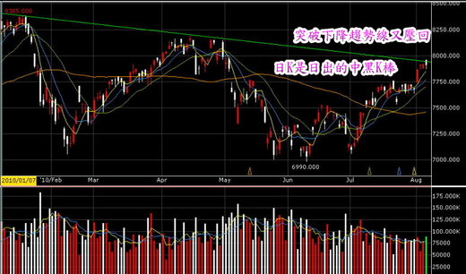 下一個線上時間8/9(也出現兩次)。8/6已經是非常關鍵的一天,如果再創新高,則漲勢則可延伸到8/9,否則見高反轉多空就要交替了。