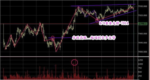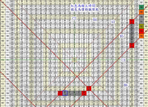 8/6:台指期以小低盤7890開出(剛好在價格觀察點),多頭先緩步走堅到平盤後,空方隨即攻擊,將指數殺到7880(沒破8/5低點7875)。多頭又再發動反擊,最高到7932,最後以7929收盤,正好收在B5-792上。多方昨天在創新高後,今天高不過高、低不破低,多空雙方僵持,收出母子線(孕出線),醞釀下周變盤的空間與時間。今天回檔雖然跌破兩個觀察點,但隨即站回一個觀察點789之上,指數也就在兩個觀察點間震盪。空方只要讓盤勢跌破789,就有機會扭轉劣勢,造成短線多翻空的格局。多方則必須背水一戰,以續創新高再奪回控球權。目前多空雙方將戰線延長到A3跟C3之間,整軍待發!