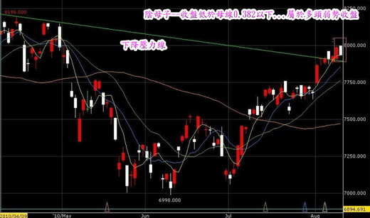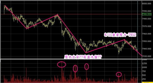 8/10:台指期以小高盤7998開出後,受制於C3-799的壓力,空方發動一波波攻擊,指數一路走低到7933,最後以7936收盤,仍然在B5獲得支撐。多方今天無法持續創新高,短線先研判8/9彈升見高,如果再跌破8/9低點7911則可以確認短線見高(8001)反轉。多方守住B5-792,動能依然存再,仍有向A4-813挑戰的機會。