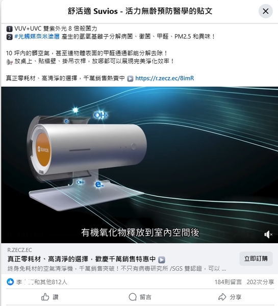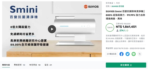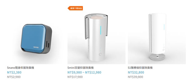 1、我看到這台機器標榜的是:抑菌除臭,太好了,正是我需要的。 2、SUVIOS|Brise,似乎有二個品牌名稱。 3、獨家APCO空氣淨化技術,可以同時消滅空氣及物體表面病菌,聽起來很厲害,等一下來研究看看。 4、VUV紫外光殺菌。 P.S.:舒活適SUVIOS的產品如下圖,中間那一個還有嘖嘖募資千萬的記錄,應該值得推薦。