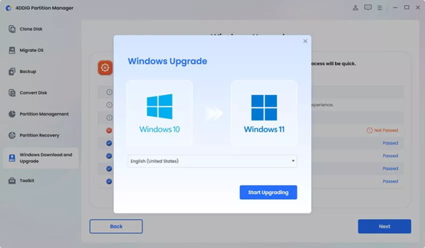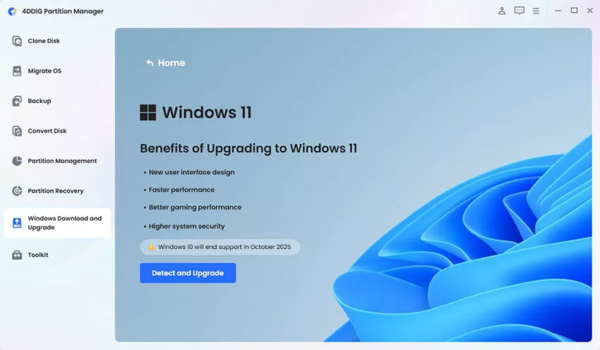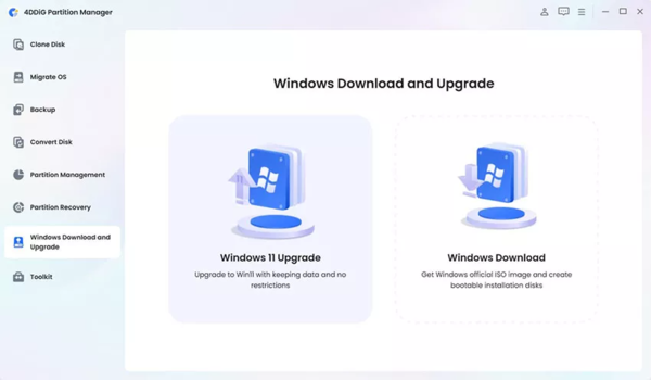 Step1:安裝並啟動 4DDiG Partition Manager。導覽至 Windows 下載和升級,選擇 Windows 11 升級。