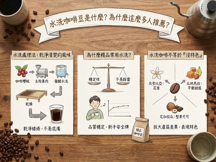 一、水洗咖啡豆是什麼?水洗處理法,讓風味更乾淨清楚水洗咖啡豆(Washed Coffee)指的是咖啡櫻桃在採收後,會先完整去除外層果皮與果肉,再透過水槽進行發酵與清洗,最後進入乾燥階段的處理方式。這個流程的核心目的,就是把「果肉帶來的不確定因素」降到最低,讓風味回到咖啡豆本身。也因此,水洗處理的咖啡,風味線條通常比較乾淨、清楚,喝起來不容易混濁或失焦。 為什麼精品咖啡常用水洗處理?在多數精品咖啡豆推薦名單中,水洗豆一直佔有很高比例,原因並不是因為它保守,而是因為它穩定。水洗咖啡的香氣、酸質、甜感與口感結構,通常比較容易被辨識,也不容易被處理法本身蓋過。對烘豆師來說,水洗豆更好掌握;對消費者來說,也更不容易踩雷,不論是手沖、美式或黑咖啡都很很適合。 水洗咖啡豆不等於「沒特色」很多人第一次聽到水洗咖啡豆,會以為它就是「清淡、沒個性」,但其實正好相反。水洗只是把風味整理乾淨,並不會把特色抹掉。好的水洗咖啡,反而更能清楚表現產區差異:衣索比亞的花香、瓜地馬拉的平衡甜感、尼加拉瓜的堅果可可,都會被放大呈現。這也是為什麼在杯測、教學或產區比較時,水洗咖啡常被當作標準參考。