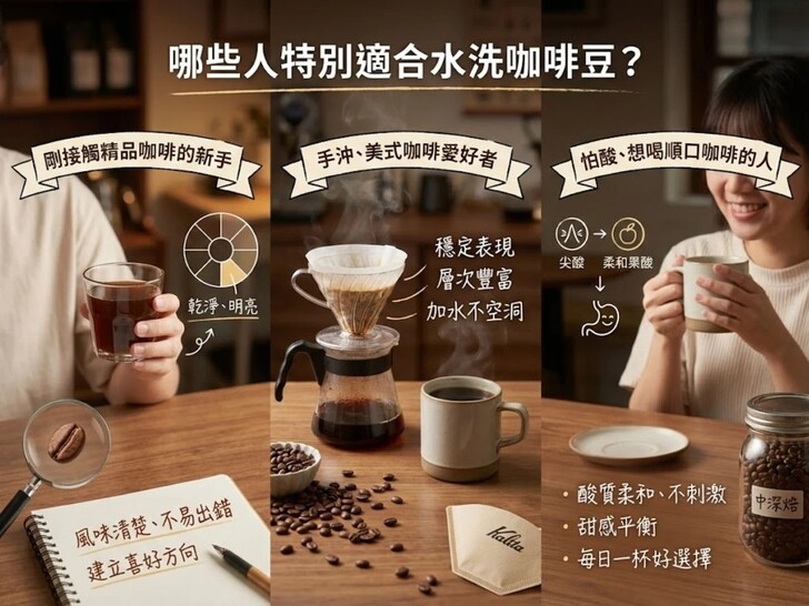 三、哪些人特別適合水洗咖啡豆?剛接觸精品咖啡的新手如果你才剛開始認識咖啡處理法,還不太確定自己偏好花香、果香還是巧克力調性,從水洗咖啡豆入門幾乎不會出錯。水洗處理的風味邏輯清楚、線條分明,不容易出現過度發酵或風味過於奔放的狀況,新手比較不會因為「喝不懂」而產生距離感,也更容易慢慢建立自己的喜好方向。 手沖、美式咖啡愛好者在手沖咖啡豆推薦清單中,水洗咖啡豆幾乎一直都是主流選項。無論是使用 V60、Kalita、Origami,或是拿來做美式咖啡,加水後風味輪廓依然清楚,不容易變得空洞或只剩水感。對喜歡慢慢喝、感受香氣與層次的人來說,水洗咖啡豆能在不同沖煮方式下維持穩定表現,是非常可靠的選擇。 怕酸、想喝順口咖啡的人很多人一聽到「有酸」就會退縮,但水洗咖啡的酸質,多半是乾淨、有輪廓的果酸或茶感酸,而不是刺激型的尖酸。特別是在中焙到中深焙設定下,酸感會被轉化得更柔和,甜感與平衡度反而更明顯。對怕酸、腸胃比較敏感,或是每天都要喝咖啡的人來說,水洗咖啡豆往往是更適合的選擇之一。