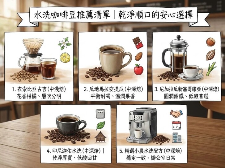 四、水洗咖啡豆推薦清單|乾淨順口的安心選擇如果你正在找水洗咖啡豆推薦,又希望風味乾淨、穩定,以下這幾款水洗豆都屬於很順口好喝的類型,不論是手沖、美式或日常飲用都很合適。 水洗咖啡豆推薦|衣索比亞古吉產區水洗咖啡豆(中淺焙~中焙)來自古吉產區的水洗咖啡豆,以花香、柑橘調性與乾淨酸質聞名。水洗處理讓風味線條清楚,香氣集中,適合喜歡清爽口感、想體驗精品咖啡風味層次的人。手沖時特別容易表現出明亮又不混亂的香氣。 水洗咖啡豆推薦|瓜地馬拉安提瓜水洗咖啡豆(中焙~中深焙)安提瓜水洗豆以平衡著稱,風味常見巧克力、堅果與柔和果香,酸感溫潤、不刺激。這類咖啡豆非常適合作為日常水洗咖啡豆推薦,不論是美式或手沖,都能呈現乾淨、順口又耐喝的表現。 水洗咖啡豆推薦|尼加拉瓜新塞哥維亞水洗咖啡豆(中深焙)新塞哥維亞產區的水洗咖啡豆,甜感穩定、Body圓潤,常帶有甜堅果、可可與蔗糖回甘。中深焙設定下,酸度自然收斂,是很多怕酸族在找不酸咖啡豆推薦時,很容易接受的一款。 水洗咖啡豆推薦|印尼迦佑水洗咖啡豆(中深焙)相較傳統濕刨法,水洗版本的迦佑曼特寧在乾淨度上更突出,同時保留印尼咖啡特有的厚實口感與回甘。適合喜歡低酸、重視口感重量感,又希望風味不要太混濁的人。 水洗咖啡豆推薦|精選小農水洗配方咖啡豆(中焙~中深焙)如果你追求穩定度,水洗配方豆會是非常安全的選擇。透過多產區水洗豆比例設計,讓香氣、甜感與口感保持一致,特別適合辦公室、美式咖啡或每天固定飲用。 更多咖啡知識文章 請到 >> https://first-cafe.com 咖啡豆推薦購買 請到 >> https://www.bestbet.tw