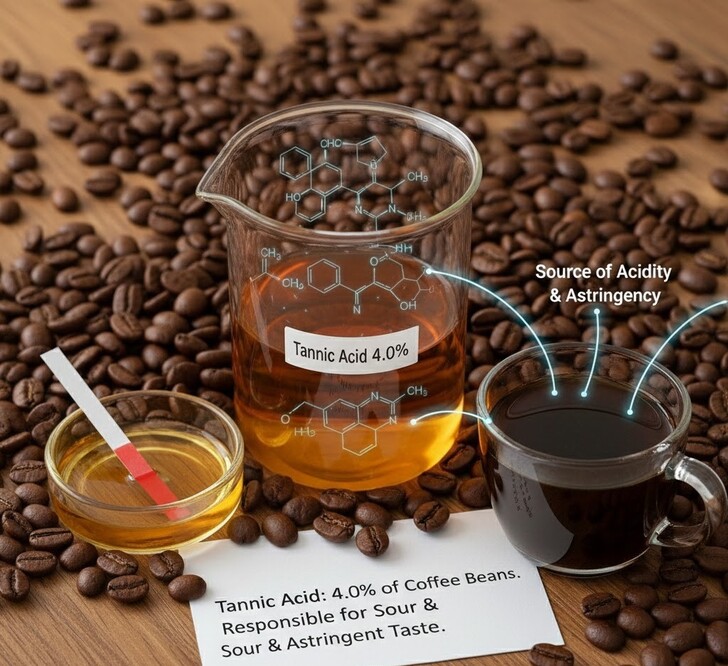 咖啡豆成分|單寧酸 4.0% 酸味與澀感的來源單寧酸約佔 4.0%,是咖啡中酸味的來源之一,同時也深刻影響咖啡的口感層次與飲用體驗。單寧酸屬於多酚類物質,常見於咖啡、茶與葡萄酒中,具有明顯的風味特性。適量的單寧酸能為咖啡帶來清爽、明亮的酸感,使風味更加立體。然而,當單寧酸含量過高時,會使咖啡產生明顯的澀味與乾口感,影響整體順口度與平衡感。 加熱與萃取對單寧酸的影響在高溫或煮沸過程中,單寧酸會發生分解,產生焦梧酸,進而改變咖啡的風味表現。過度加熱或長時間萃取,容易使單寧酸釋放過多,導致咖啡口感變得粗糙、澀口,甚至掩蓋原本的香氣與甜感。為了避免咖啡出現過度澀味,沖煮時需注意以下幾個重點: