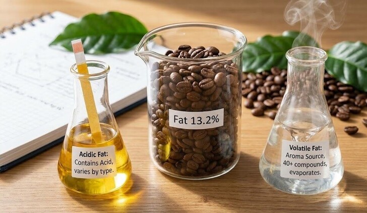 咖啡豆成分|脂肪 13.2% 香氣與口感厚度咖啡豆中約含有 13.2% 的脂肪,是構成咖啡香氣、口感厚度與風味層次的重要成分之一。咖啡脂肪主要可分為酸性脂肪與揮發性脂肪,兩者對咖啡的風味表現各自扮演不同角色。 ① 酸性脂肪|影響風味強弱與口感平衡酸性脂肪是指脂肪中含有酸性物質,其酸度強弱會隨咖啡品種、產地與處理方式而有所不同。這類脂肪會影響咖啡的整體風味輪廓,使口感更加圓潤或具有層次感,並與咖啡的酸、苦之間形成平衡。 ② 揮發性脂肪|咖啡香氣的核心來源揮發性脂肪是咖啡香氣的主要來源,能釋放出約四十種以上的芳香物質,包括堅果、焦糖、花果與巧克力等香氣。 脂肪含量對咖啡品質的影響