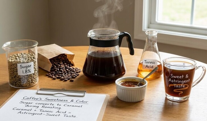 焦糖與單寧酸的風味交互作用當烘焙後形成的焦糖與單寧酸結合時,會使咖啡呈現出**「澀中帶甜」的風味特性**。這種口感常見於中焙至中深焙咖啡,是許多咖啡愛好者喜愛的平衡風味表現。而糖含量對咖啡風味的影響如下:
