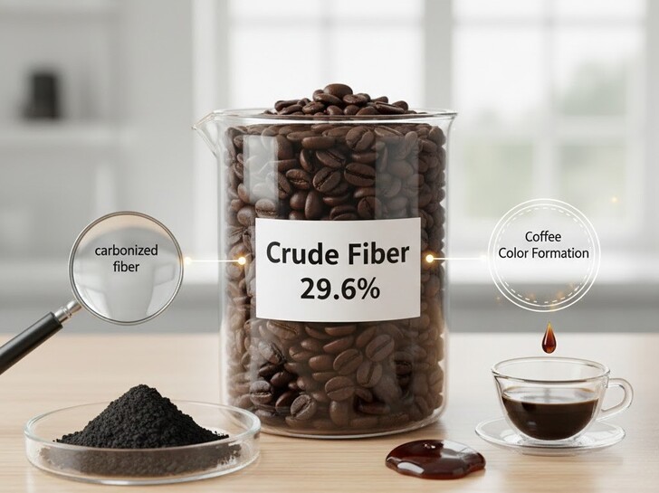 咖啡豆成分|粗纖維 29.6%咖啡色澤形成咖啡豆中約含有 29.6% 的粗纖維,是咖啡色澤形成的來源。粗纖維在咖啡成分中占比最高之一,對咖啡外觀與烘焙後的視覺表現具有決定性影響。 粗纖維在烘焙中的變化過程
