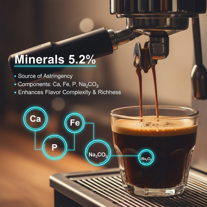 咖啡豆成分|礦物質 5.2%微澀口感的來源咖啡豆中約含有 5.2% 的礦物質,是咖啡中微量澀味的來源之一。雖然在整體風味中所佔比例不高,但礦物質對咖啡口感結構與層次仍具有輔助性的影響。 咖啡中常見的礦物質成分咖啡所含的礦物質主要以微量元素形式存在,包括: