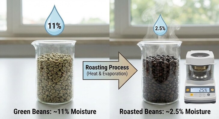 咖啡豆成分|水分 2.5%烘焙完成與保存咖啡豆在烘焙完成後,約含有 2.5% 的水分。相較之下,咖啡生豆約含有 11% 的水分,在烘焙過程中,水分會隨著高溫逐漸蒸發,最終留下適合保存與沖煮的含水比例。 生豆到熟豆的水分轉變咖啡生豆原本含有較高的水分比例,透過烘焙加熱,水分逐步被釋放,並促進咖啡豆內部的化學反應。當烘焙完成後,水分含量降低至約 2.5%,代表咖啡豆已達到穩定狀態。 水分含量對咖啡品質的影響