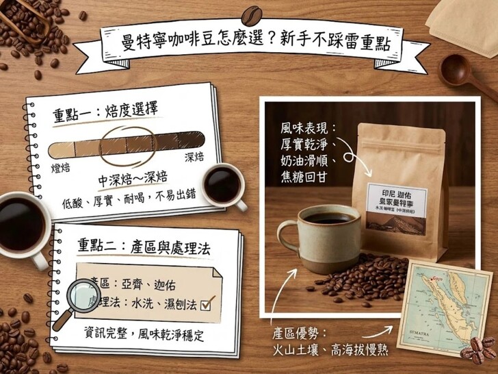 四、曼特寧咖啡豆怎麼選?新手不踩雷重點選中深焙~深焙最穩對多數人來說,曼特寧咖啡豆最迷人的地方,就是低酸、厚實、耐喝,而這些優點在中深焙到深焙時最容易被完整表現出來。這個焙度能讓原本的草本與可可調性轉化為更圓潤的苦甜平衡,口感穩定、不刺激,就算每天喝也不容易疲勞。新手如果不確定該從哪個焙度開始,直接選中深焙幾乎不會出錯。 注意處理法與產區標示在挑選曼特寧咖啡豆時,建議多留意包裝上的資訊。標示清楚的產區(如亞齊、迦佑)與處理法(水洗、濕刨法),通常代表豆子來源與後製流程較為完整,風味表現也會更乾淨穩定。相反地,如果只有寫「曼特寧風味」卻缺乏產區與處理資訊,品質落差可能會比較大,新手反而容易踩雷。 更多咖啡知識文章 請到 >> https://first-cafe.com 咖啡豆推薦購買 請到 >> https://www.bestbet.tw